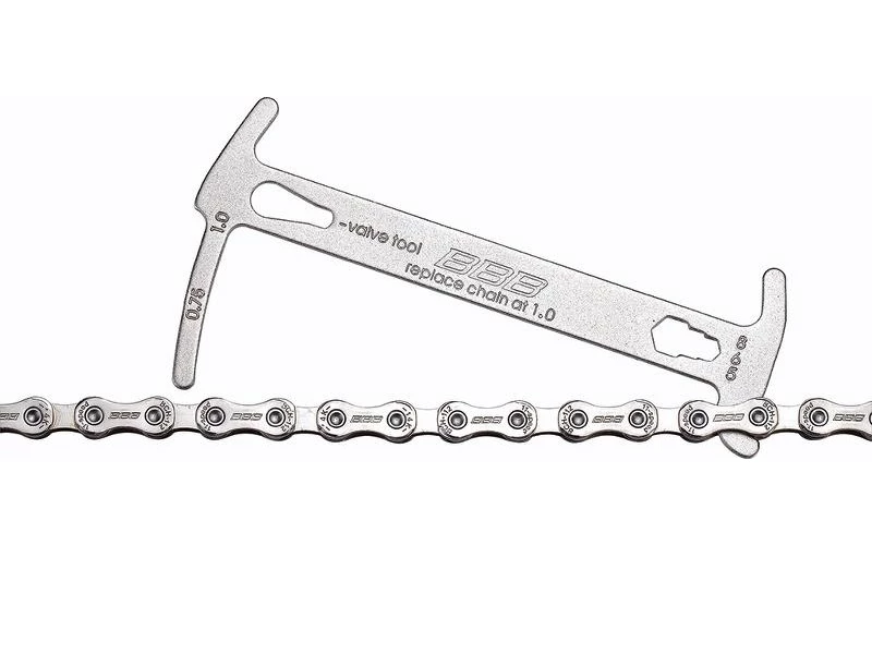 Denne smarte ChainChecker bruges til, at finde ud af om du trænger til en ny kæde på din cykel. Det er et billigt stykke værktøj, som hurtigt kan afgøre hvor slidt din kæde er. Kæden bør skiftes ved 75% slid, hvilket let ses på værktøjet. Når værktøjet når ned til 1, skal kæden skiftes øjeblikkeligt, da den ellers vil ødelægge kranksæt og kassette.