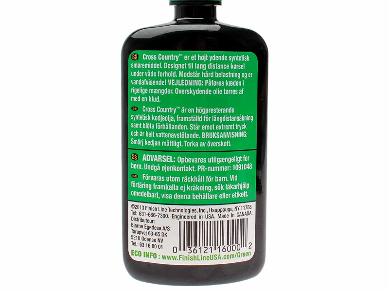 Finish Line Kædeolie Cross Country er en særligt effektiv kædeolie, der er ideel til kørsel i våde vejrforhold. Kædeolien er skabt med syntetiske og tyktflydende olier samt vandskyende polymerer og tilsætningsstoffer, der afværger tegn på slid og ælde. Finish Line-olien er våd både under og efter påføring samt har en langtidsholdbar virkning for ultimativ og lydløs fremdrift. Der gives desuden ultimativ rustbeskyttelse i selv de mest ekstreme køre- og vejrforhold, så cyklen holdes i god stand så længe som overhovedet muligt.