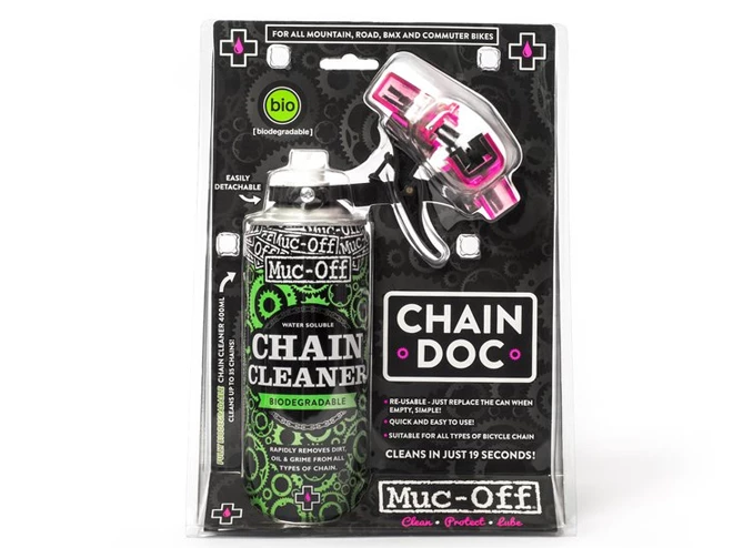 Med dette produkt føles det næsten som at få en ekstra hånd foræret. Din ene hånd sprayer, den anden drejer pedalerne så kæden er i bevægelse. Den tredje hånd kommer fra Muc-Off der med sin integreret kæderenser, børster og plejer kæden samtidig med at der sprayes med den bionedbrydelige kæderens.