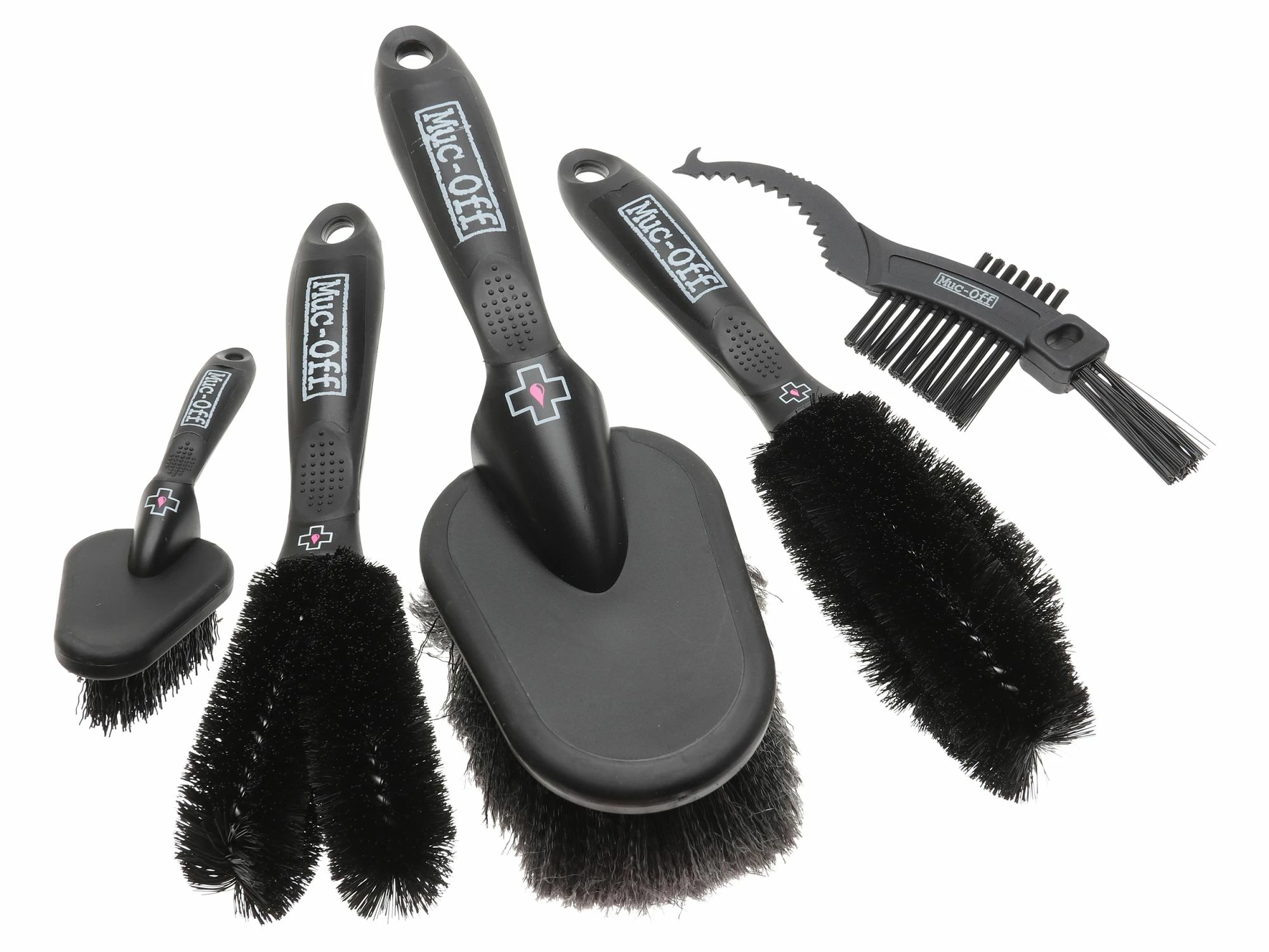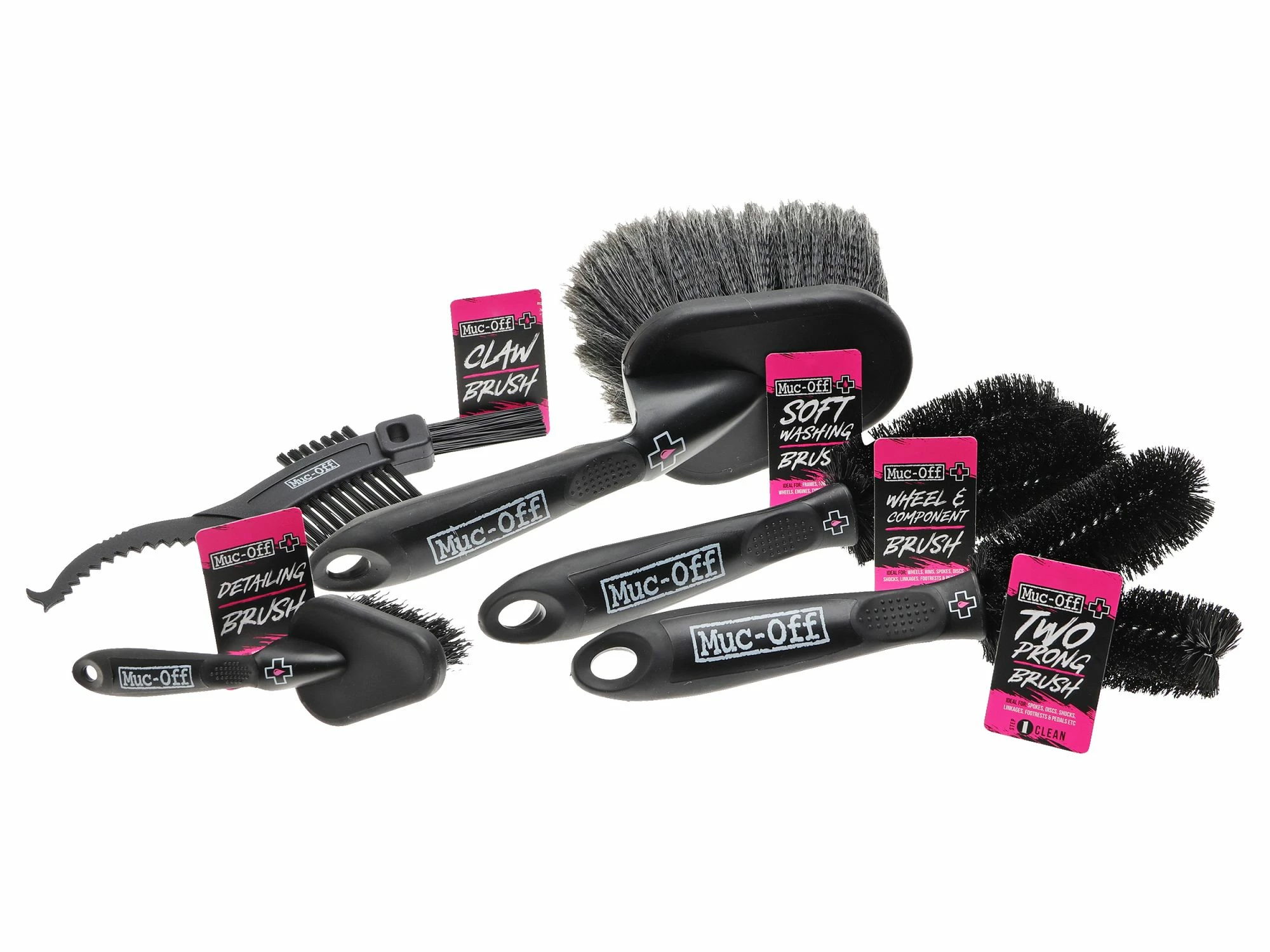 Alsidigt børstesæt fra Muc-Off, der indeholder alt, du skal bruge for at holde din cykel ren og velkørende. Sættet indeholder 1 Soft Washing Brush, 1 Detailing Brush, 1 Claw Brush, 1 Wheel & Component Brush samt 1 Two Prong Brush. Soft Washing Brush er oplagt til større flader, mens Detailing Brush træder i karakter, når der sidder snavs på mere snævre steder. Man anvender Claw Brush til rengøring af kæde, kassette samt tandhjul, og Wheel & Component Brush er det perfekte redskab til rengøring af hjul, eger samt fælge. Slutteligt er Two Prong Brush det perfekte valg, når der sidder genstridigt snavs på eksempelvis eger, bremseskiver, krank og pedaler.
