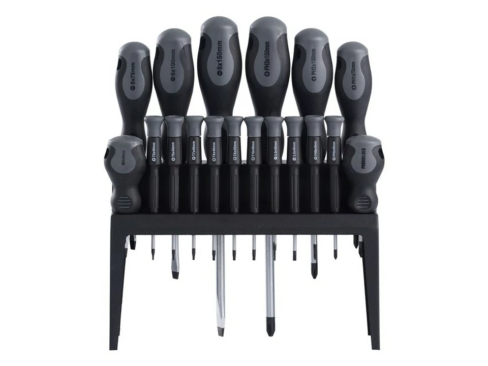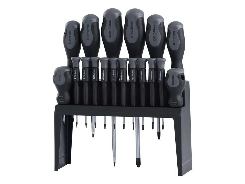 Alsidig skruetrækkersæt med ergonomiske håndtag, som består af 18 dele og med en praktisk stand til at opbevare skruetrækkerne i, når man ikke bruger dem.