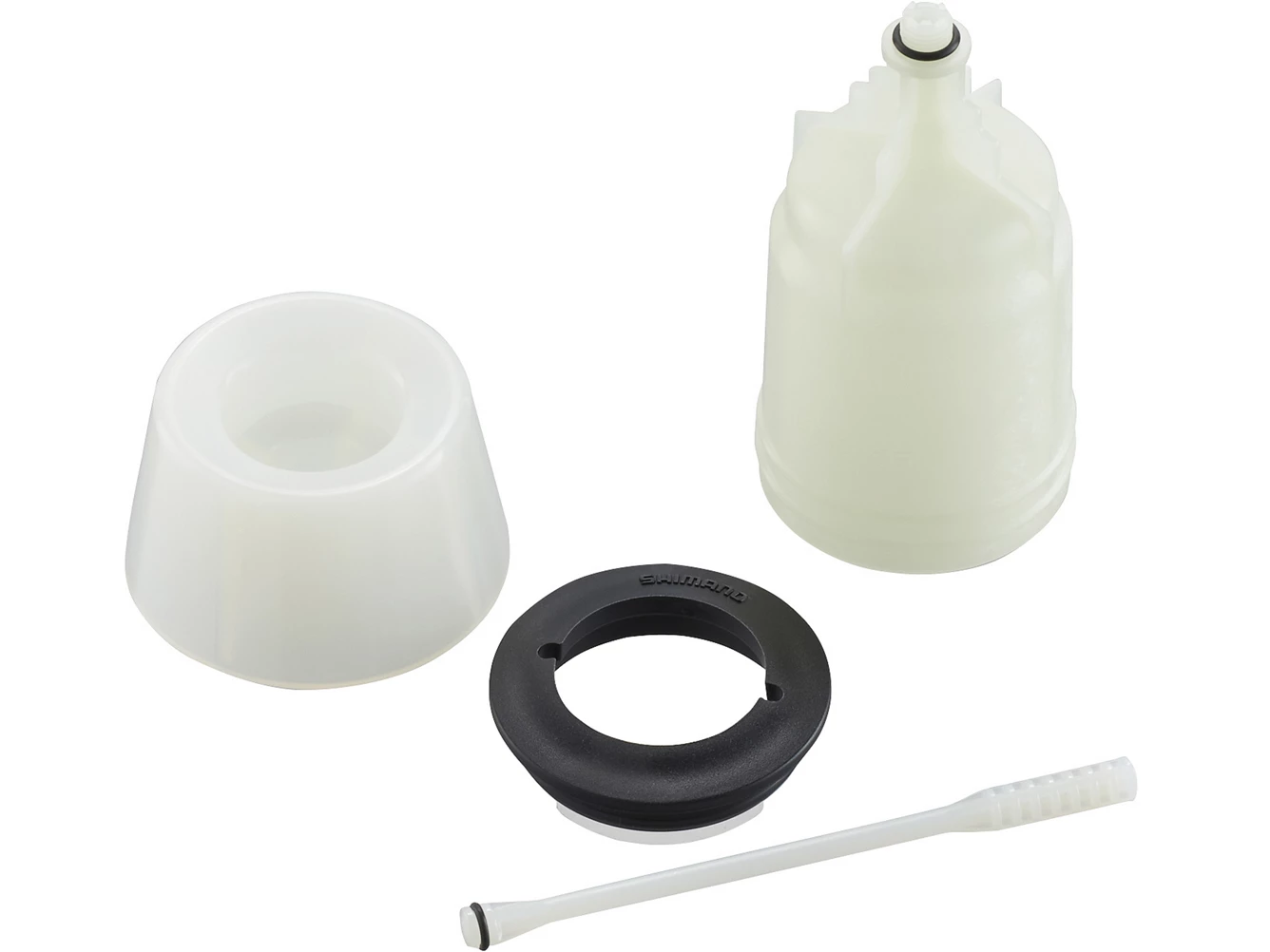 Ved udluftning skrues topskruen forsigtigt af og herefter skrues koppen i. Fyld Shimano bremsevæske i koppen og pil pinden op. Tryk nu på forbremsen indtil der ikke kommer flere luftbobler. Sæt pinden i igen, skru koppen af og topskruen i igen.