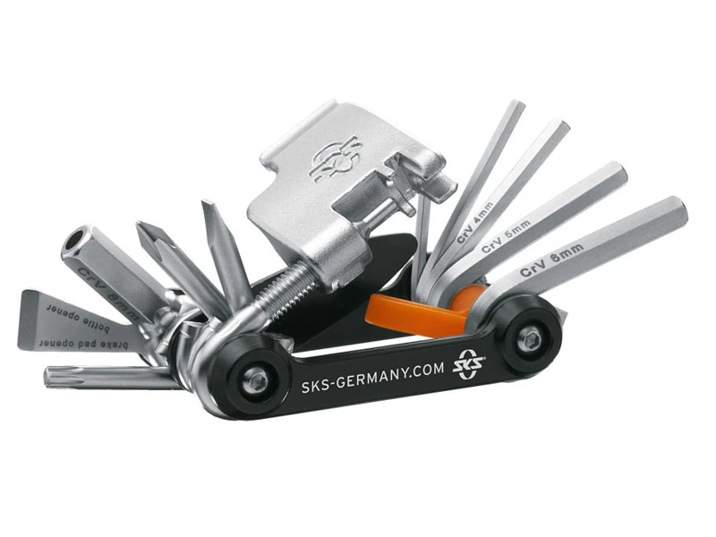 SKS Tom 18 er et foldeværktøj med 18 funktioner i slidstærk kvalitet og med en størrelse, der gør det nemt at have med i sadeltasken eller jakkelommen. Multiværktøjet er skabt i rustfrit stål for god styrke og en lang levetid. Tom 18 foldeværktøjet fra SKS indeholder 6 unbrakonøgler, skruetrækkere, 1 torxnøgle, 1 kædeadskiller, 1 egernøgle samt 2 dækjern og en oplukker.